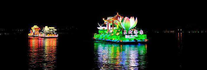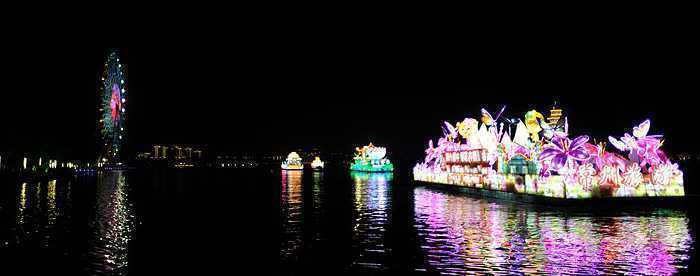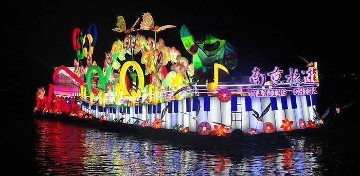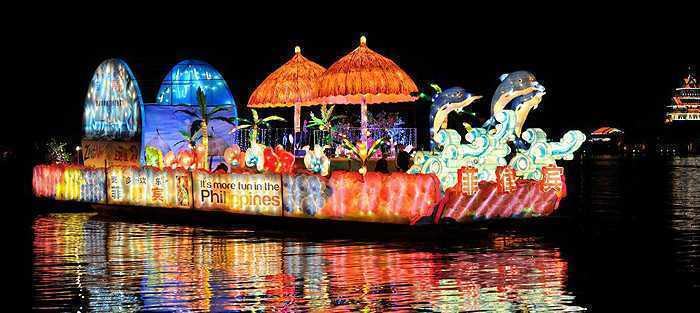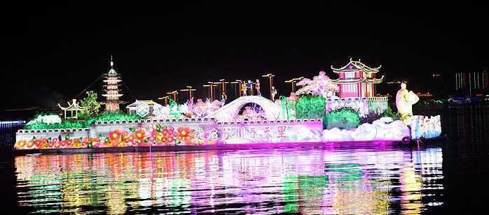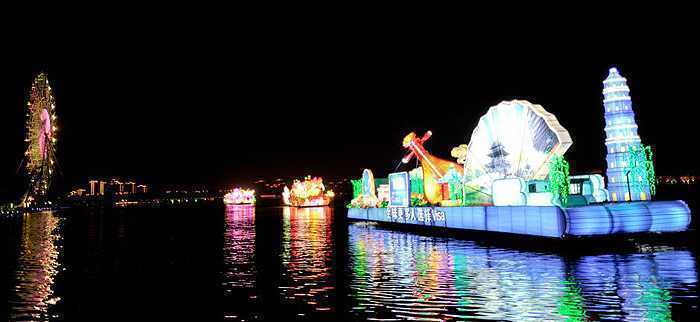 2013年4月10日晚,“东方水城”第十六届中国苏州国际旅游节彩船巡游在苏州金鸡湖畔惊艳启幕,来自马来西亚、菲律宾、美国、中国等国家的12艘造型各异、别具风情的彩船进行巡游。